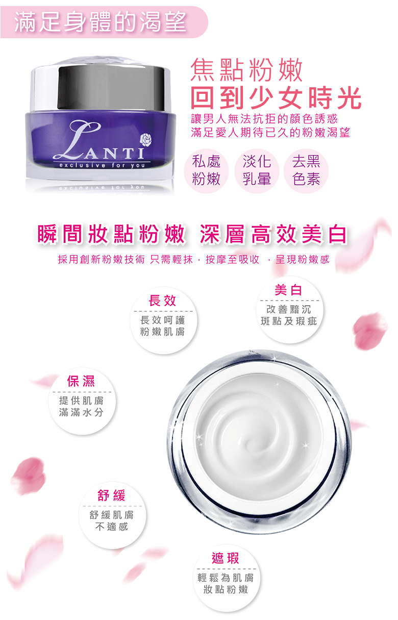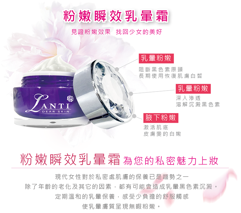 粉嫩瞬效乳暈霜:早晚塗抹少量於乳暈部位,輕輕按摩直到吸收為止,再穿上內衣。